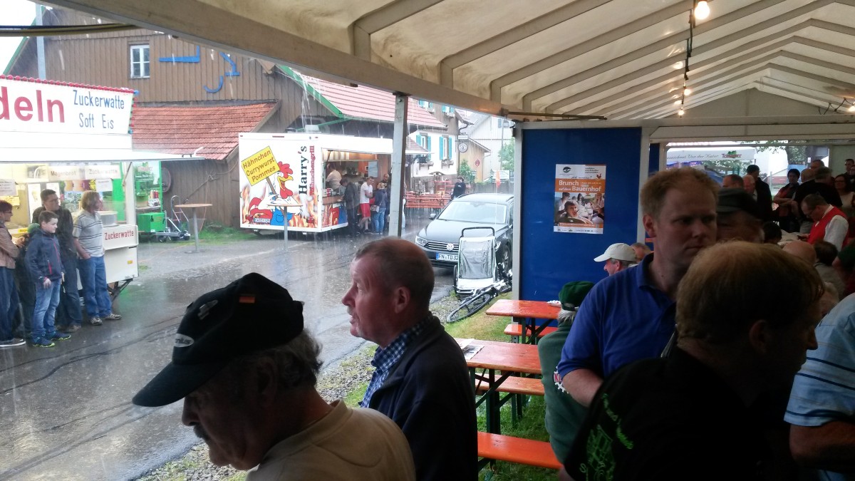 Der Regen hatte sich am Sonntag zurückgehalten, jedoch zum späteren Nachmittag kam noch ein Regenschauer, der alle Besucher wieder in das Festzelt und in den bewirteten Geräteschuppen trieb, sodass - nachdem alle Sitzplätze belegt waren - viele auch nur mit einem Stehplatz und einem Getränk in der Hand von der abwechslungsreichen und in der Region einmaligen Veranstaltung begeistert waren.